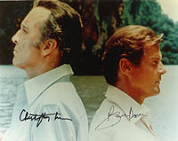 | #2008 The man with the golden gun US $ 229.00 8x10 color shot from THE MAN WITH THE GOLDEN GUN. Wonderfully signed by Roger Moore and Christopher Lee. VERY RARE item!!! Both thogether are so rare to get,especially with such wonderful authentic signatures. From a Swedish private Collection. The Roger Moore signature was obtained in-person in Sweden, the Chris. Lee was obtained through the mail in GB. |