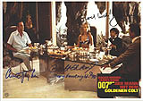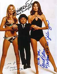 | #4874 MAN WITH THE GOLDEN GUN US $ 499.00 -Front Piece!!!- Fantastic 8x10 color shot from NIK NAK; ANDREA ANDERS AND MARY GOODNIGHT IN THE MAN WITH THE GOLDEN GUN. Signed by ALL three: Herve Villechaize (dec.), Britt Ekland and also Maud Adams. Right out from my private collections. NO DISCOUNTS for this piece. |