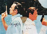 | #3402 Man with the golden gun US $ 229.00 Wonderful 8x10 color shot from THE MAN WITH THE GOLDEN GUN; SIGNED BY ROGER MOORE AKA JAMES BOND AND CHRISTOPHER LEE AKA FRANCISCO SCARAMANGA. Both together are very hard to get meanwhile. A tough, and valuable cast autograph! Obtained from a private GB collector. |