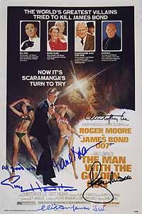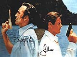 | #4927 Man with the golden gun US $ 229.00 Wonderful 8x10 color shot from THE MAN WITH THE GOLDEN GUN; SIGNED BY ROGER MOORE AKA JAMES BOND trough the mail AND CHRISTOPHER LEE AKA FRANCISCO SCARAMANGA in a private signing for a GB friend. Both together are very hard to get meanwhile. A tough, and valuable cast autograph! |