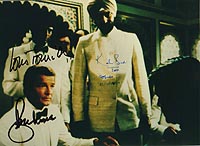 | #5467 David Meyer & Tony Meyer US $ 299.00 Incredible nice 8x10 color photograph from Octopussy. Shown are David and Tony Meyer (Twin actors who portrayed Mischka and Grischka, the knife throwing assessins in Octopussy. Signed by both. This is a real one of a kind. Nearly impossible to get. Obtained directly from David Meyer, who forwarded the photo also to his brother to sign it also, in October 2003. We had to wait 3 years (!!!) for these autographs! Incredible rare! |