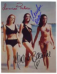| #4327 THUNDERBALL US $ 339.00 Incredible nice 8x10 color "behind the scenes" photograph from THUNDERBALL, super signed by all three: Luicana Paluzzi aka Viona Volpe (obtained trough a private collection), Claudine Auger (in-person) and 007 allie Martine Beswhick (trough the mail). Incredible rare combination of Bond girls! Take the chance! One of the best pieces we got in the last months. |