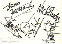 | #3277 Duran Duran US $ 129.00 Awsome 4x6 white card signed by all crew members of Duran Duran, all signatures obtained in-person in Birmingham/GB. Perfect to mat with an LP from A VIEW TO A KILL. RAREST! |