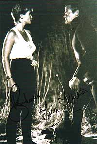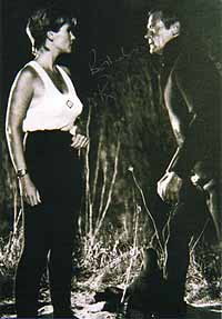 | #4505 A VIEW TO A KILL US $ 249.00 Fantastic 8x10 bw shot as 007 and Paula. Signed by Roger Moore AND Fiona Fullerton perfectly. Both signatures are clearly visible on the original piece. Sorry for the poor scan. Tough combination! |