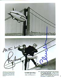 | #3783 A View To A Kill US $ 269.00 Very rare 8x10 bw shot from A VIEW TO A KILL, jointly signed by Roger Moore and Christopher Walken. Roger signed in April 2001 in London/GB and Chris was obtained in-person in Bevely Hills from a world famous star-chaser. Buy with confidence! |