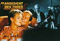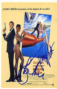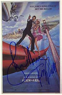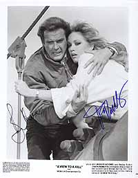 | #3980 VIEW TO A KILL US $ 249.00 Terrific 8x10 color shot from A VIEW TO A KILL, jointly signed by Roger Moore and Fiona Fullerton. Rare combination on a rare photo. Both signatures obtained trough the mail from them in London,GB |