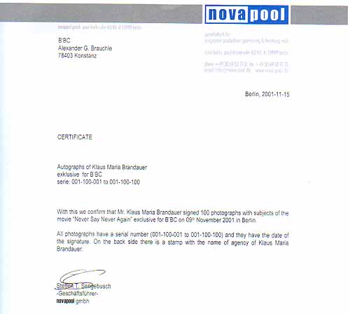 We are pleased to present a WORLD EXCLUSIVE selection of autographs from KLAUS MARIA BRANDAUER AS LARGO IN NEVER SAY NEVER AGAIN. Klaus Maria signed these autographs directly and officially world-exclusive for B'BC president Alexander G. Brauchle in Novermber 2001. All of the autographs in this section are from this private signing for us. Mr. Brandauer signs James Bond related photos from now world exclusive for B'BC by contract. Se we are from now THE OFFICIAL LICENSED SOURCE for Klaus Maria Brandauer autographs and the world exclusive place to sell his James Bond autographs. Each autograph has an OFFICIAL serial number and it has the date of the signature. On the back side there is a stamp with the name of agency of Klaus Mary Brandauer. We can offer these awsome RARE autographs for wholesale prices. Each autograph comes with the copy of Mr. Brandauers COA for us! Buy with confidence from B'BC