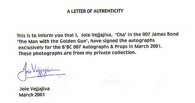 She signed all autographs: Joie Vejjajjiva "CHA" 007 The Man with the golden gun 1974"