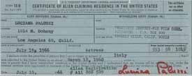 Top rarity item of Luciana Paluzzim, James Bond Girl Fiona Volpe in Thunderball. This item is a signed 'Certificate of Alien Claiming Residence In The United States' form from 1966, professionally double matted with a color portrait as 'Fiona Volpe' in James Bond's 'Thunderball'. The overall size is 14x18 and it is ready to frame. TOP RARE one of a kind item!