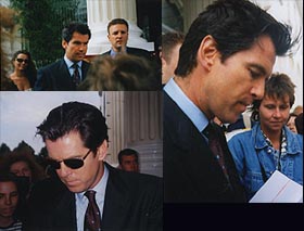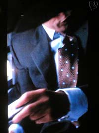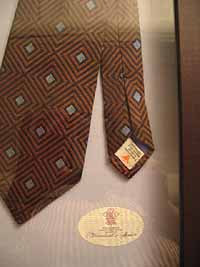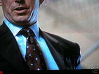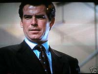 TOP HERO PROP WORN BY PIERCE BROSNAN! An ORIGINAL Turnbull&Asser tie, used by Pierce Brosnan in different scenes of TOMORROW NEVER DIES. It was worn by him trough the Carver office break-in scenes, the hotel confrontation with Dr. Kaufmann and the BMW remote carpark scenes. We have reviewed TND and the diamond pattern configoration on this tie matches the tie Pierce Brosnan wears in the car park sequences EXACTLY! SEE ALSO THE PHOTOS WE MADE WHEN PIERCE CAME BACK FROM THE HAMBURG BOND SET TO HIS HOTEL IN HAMBURGE (THE ATLANTIC - ALSO PART OF THE FILM) AND HE STILL WORE THE COMPLETE CAR CHASE SUIT AND OUR TIE! The tie comes also with this private photos! Especially this tie is also featured on different photos from the film and lobby cards, awsome proveniance. Turnbull&Asser ties are very special and most exclusive. This tie was designed by Lindy Hemming, the production designer on all of Pierce Brosnans James Bond films. It is made from 100% English silk by Turnbull and Asser, London. Up until Die Another Day, these ties where made specifically for the Bond films based on Lindy Hemmings design, and where not off the peg merchandise in Turnball&Asser shops! The tie comes with the two original lobby cards and FULL documentation when and where it was WORN BY PIERCE! It was obtained directly from a man who worked for Warner Bros and had the chance to get this wonderful tie. This tie shows small signs of wear around the edges but this is normal as it was used and is no backup one! Wonderfully custom framed and mounted with a picture of Pierce Brosnan wearing this tie! A one time chance!