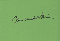 Extremely rare signature on a gree paper of Cassandra Harris as Countess Lisl von Schlaf in FOR YOUR EYES ONLY. She was also Pierce Brosnan's first wife and died already in 1991. Extremely rare signature and comes with an awsome rare 8x10 color shot as Lisl von Schlaf.