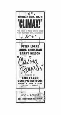 We could aquire a wonderful in-person album page collection from a top source of us in UK. All signatures were signed in-person for this collector and now he sold off his collection!Part of this collection is the following extremely rare vintage original autographed 4x6 blue album page of long long deceased Peter Lorre! We got him again! A LOT OF BOND FANS DON'T KNOW THAT PETER LORRE (WORLD FAMOUS FOR MR. MOTO FILMS IN THE 30'S) WAS THE FIRST BOND VILLAIN! HE PLAYED THE ROLE OF "LE CHIFFRE" IN "CASINO ROYALE 1957", an one-hour, live television dramatization that was broadcast on the CBS Climax Mystery Theater on Oct. 21, 1954. Little more than one year after Ian Fleming had published his first 007 novel CASINO ROYALE. The original CBS television version of "Casino Royale" was produced for the "Climax!" anthology series. Peter Lorre stars as the the villainous Le Chiffre. EXTREMELY RARE autographed 007 memorabilia! Peter Lorre autographs are extremely rare as he died already in the 1960's. This items comes with 2 TOP RARE 8x10 photographs from Casino Royale 1957! Normally even no photos exist for this film! Perfect for matting purposes and a real rarity piece for your 007 collection! Inscribed to Peter!