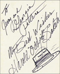EXTREMELY RARE 5x5 bw vintage photo card signed by Harold Sakata aka Oddjob in Goldfinger on the reverse side. These style of photos he sent out in the 60's and 70's. Awsome signed by his more than tough to find Bond actor (1920–1982) and former silver-medal-winning Olympic wrestler best known for his role as the deadly hat–wielding Oddjob in the classic Bond film Goldfinger. Scarce glossy 4 x 5 photo of Sakata in his natty Oddjob costume, signed and inscribed in black felt tip on the reverse, My best wishes, Harold ‘Odd-Job’ Sakata,” Sakata adding a sketch of his flying hat; he has also added a similar sketch to the image itself. In very fine condition! He is todays nearly not to find anymore. Highly collectible!