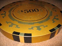 A top rare very special prop from the brandnew 007 film CASINO ROYALE! After DIE ANOTHER DAY FAMOUS HARRODS IN LONDON DECORATED THEIR WINDOWS AGAIN BEFORE CHRISTMAS 2006 (JUST THE RELEASE TIME OF CASINO ROYALE)WITH ORIGINAL PROPS AND WARDROBE PIECES USED IN CASINO ROYALE. THEY USED FOR DECORATION ALSO THESE GOLDEN OVERSIZED CASINO CHIPS. Harrods has decked out all its 72 road frontage windows with scenes and products from Casino Royale. Harrods Christmas windows have always been a study in over-the-top presentation, and more so this Christmas as Casino Royale mania takes over the store. Traffic literally grinds to a crawl these days as drivers slow down to marvel at the extravagant window displays. Larger than life (like everything else in the movie), each golden chip is about the size of an Aston Martin wheel. Denominated in dollars, the chips cast a golden spell, popping up everywhere in the materialistic world that is James Bond’s.
