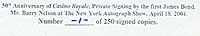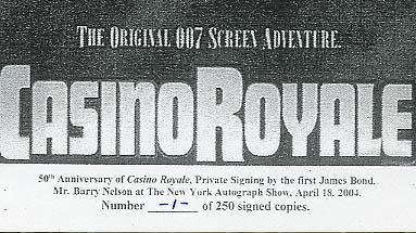 A WORLD EXCLUSIVE SIGNING! MEANWHILE DECEASED 007 JAMES BOND ACTOR BARRY NELSON DID HIS ONLY OFFICIAL SIGNING FOR THE "50TH ANNIVERSARY OF CASINO ROYALE" AT THE NEW YORK AUTOGRAPH SHOW ON APRIL 18, 2004. A FRIEND OF B'BC RAN THIS AUTOGRAPH SHOW AND GOT A LIMITED EDITION SIGNING OF 250 PRINTS DONE BY BARRY NELSON AT THE SHOW. WE OWN THE ENTIRE COLLECTION OF THIS LIMITED EDITION SIGNING OF 250 8x10 BW CASINO ROYALE AUTOGRAPHS (FROM NO.1 TO NO. 250). NOW WE RELEASE THIS INCREDIBLE ITEMS FOR SALE! EACH AUTOGRAPH HE HAND SIGNED EACH PIECE WITH "BARRY NELSON 007". BARRY NELSON NEVER DID BEFORE THIS SIGNING ANY SIGNINGS AND ONLY A FEW AUTOGRAPHS ARE IN COLLECTORS HANDS WHO GOT HIM TROUGH THE MAIL. ALSO HE DID NOT LIKE TO SIGN VERY MUCH AND NEVER DID A SECOND SIGNING TILL TO HIS DEATH IN APRIL 2007. A REAL RARITY AUTOGRAPH! TAKE THE CHANCE AS THE LIMITED EDITION WILL BE SOLD OUT FAST. EACH AUTOGRAPH ONLY 60.00 EUROS. ON THE REFERENCE PHOTOS YOU CAN SEE BARRY NELSON AND HIS WIFE ON SUDAY APRIL 18,2004 AT THE SIGNING. ON THE OTHER REFERENCE PHOTO YOU CAN SEE MR. AND MRS. BARRY NELSON AND LYNNE E. KEYES WHO WAS PRESIDENT OF THE IACC-DA AUTOGRAPH CLUB AT THAT TIME. WE ALSO HAVE REFERENCE LETTERS FOR THE SIGNING!