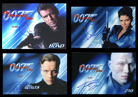 THIS IS A ONE OFF DISPLAY RARITY! 4 X 8X10 COLOR SHOTS FROM THE MAIN CAST OF DIE ANOTHER DAY. ALL 4 INDIVIDUAL SHOTS ARE SIGNED BY THE 4 PICTURED DIE ANOTHER DAY STARS IN-PERSON FOR ONE OF MY BEST STAR CHASERS: PIERCE BROSNAN (007) SIGNED IN-PERSON AT AIRPORT TEMPELHOF, BERLIN, GERMANY ON JULY 3, 2008. HALLE BERRY (JINX) SIGNED IN-PERSON FOR HIM AT THE CATWOMAN PREMIERE IN HAMBURG GERMANY IN 2004.TOBY STEPHENS (GUSTAV GRAVES) SIGNED IN-PERSON FOR HIM AT HIS THEATRE PLAY IN NOVEMBER 2007, LONDON, UK AND LAST BUT NOT LEAST RICK YUNE ALSO SIGNED IN-PERSON AT THE HOTEL CONCORDE BERLIN IN 2008 WHEN HE WAS FILMING IN BERLIN. CRYSTAL CLEAR HISTORY FOR ALL SIGNATURES AND ALL 4 MAJOR SIGNATURES ON MATCHING PHOTOS TO COMPLETE THE SET IS A ONE OFF CHANCE IN YOUR COLLECTORS LIFE! HIGHLY VALUEABLE!