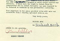 A REAL TOP RARITY! WONDERFUL GROUCHO MARX 2 PAGES CONTRACT OF ORSON WELLS, SIGNED WONDERFULLY BY ORSON WELLS ON THE LAST PAGE. ORSON WELLS STARRED IN THE ROLE AS LE CHIFFRE IN CASINO ROYALE 1967. COMES WITH AN 8X10 COLOR SHOT AS LE CHIFFRE IN CASINO ROYALE.PERFECT FOR MATTING PURPOSES. ORSON WELLS IS NEARLY IMPOSSIBLE TO GET IN AUTHENTIC FORM. WITH A CONTRACT YOU ARE ON THE 1000% SAFE SIDE!