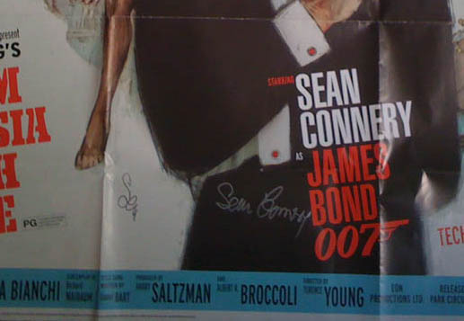 A REAL ONE-OFF FIND! ORIGINAL BIG 80X60CM CINEMA POSTER FROM FROM RUSSIA WITH LOVE. Awsome in-person signed Sean Connery. Superb signed by him in-person for one of my UK star chasers on THURSDAY, JUNE 17, 2010 at the launch of his Sean Connery plaque in Edinburgh,Scotland when he attended the Edinburgh Film Festival. Signed by him when he unveiled a plaque in Fountainbridge, Edinburgh. There is a nice little story behind the signature. He started first to sign the poster with the silver pen in the light area with "Sean". The Sir Connery said: "Oh i should sign in the darker area" and started new and signed wonderfully in the dark area of the poster. He told us that he will no more attend next year to the festival. So it was the last chance to get him there. GET THE REAL DEAL from b'bc! AND A PIECE LIKE THIS YOU WILL NOT FIND ANYMORE! Hav a look at the reference photo from the signing!