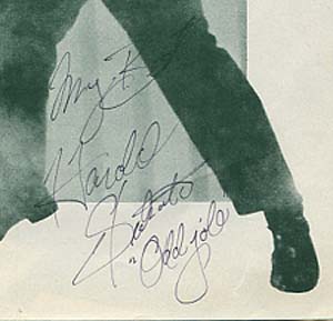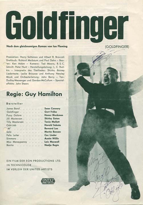 Vintage original GOLDFINGER FILM RELEASE YEAR 8x10 bw cinema program page, signed by Harold Sakata aka MR ODDJOB in GOLDFINGER. He wonderfully signed this still with his name in fountain pen!Incredible nice piece! Harold Sakata is today nearly impossible to get, especially on such a nice film release year example.Obtained from a fine private collection. A must to complete your James Bond collection!