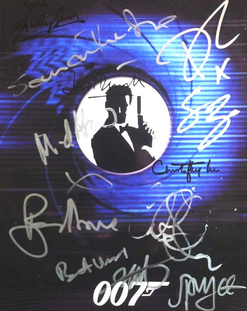 Fantastic piece and a real one of a kind! Original 8x10 color shot from the OFFICIAL JAMES BOND EXHIBITION IN BRADFORD, UK FROM 23.03.02 TILL 01.09.02. This shot is signed incredibly nice by 11 James Bond stars including rarest names and 2 Bond's themselves! All signatures were obtained from a guy who worked at this exhibition and a film museum in UK and had the chance to get all these names on this color shot over many years collecting time. All signed wonderfully. Signed by: Daniel Craig(007), Roger Moore(007),Shirley Bassey(Goldfinger title song singer), Samantha Bond(Moneypenny),Maryam D'Abo(Kara Living Daylights), Christopher Lee (Scaramanga MWTGG),Judi Dench(M),Colin Salmon(Robinson MI6),Sean Bean(006 Alec Goldeneye), Jonathan Pryce(Elliott Carver TND) and Monty Norman (composer of the famous James Bond Theme from Dr.No till Skyfall, still the beginning of each Bond movie). Incredible front piece for your collection