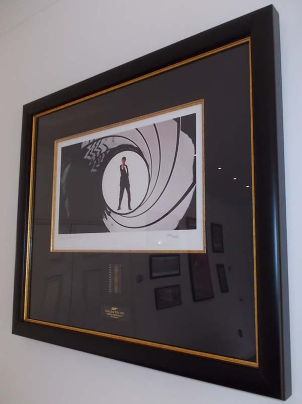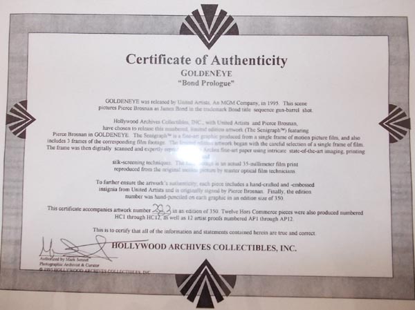 A WONDERFUL DISPLAY! Official United Artists Goldeneye Display with gun barrell lithography which is orginal and officially signed by Pierce Brosnan with his super clear signature and matted with an original major Goldeneye film cell from the gun barrell opening sequence of the film. Normally impossible to get. The lithography is blind stamped with the United Artists logo and comes of course with official coa documentation. Limited edition of 350 worldwide. Impossible to find on the collectors market.