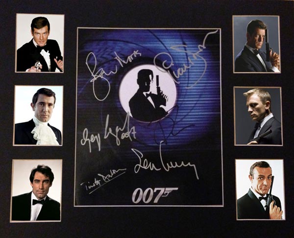This is a one-off in the world! A true all 6 Bond's color shot signed by ALL 6 James Bond actors in-person over a period of 6 years. All signatures were obtained in-person by our star chaser. Sean Connery signed at the Sheraton Grand Hotel in Edinburgh August 2006, George Lazenby signed at the Collectormania Midlands in April 2009, Pierce Brosnan signed at O2 Arena in London on October 2012, Roger Moore signed in-person at the Royal Albert Hall in May 2011. Daniel Craig signed at the Casino Royale Premiere in London November 2006. Finally Timothy Dalton signed at the Manchester football ground in January 2013. Dalton was attending a Manchester City game on New Years Day in Manchester. My collector waited for hours and Timothy actually HAPPILY signed several items for fans.It seems he changed his signing habits as he normally often refused to sign Bond shots. But in the last time we heard often that he signs way better. This is a real one of a kind piece. For sure the only one worldwide. It took 6 years to get this together! A real masterpiece for a serious 007 collection.