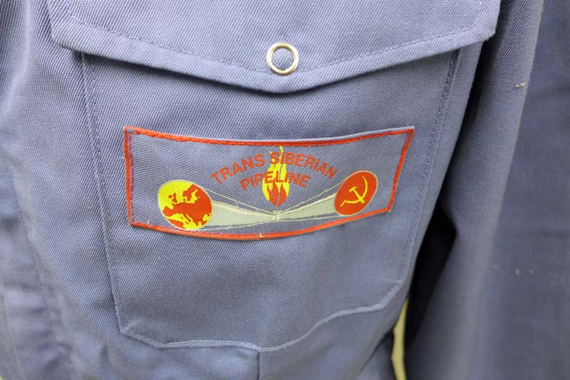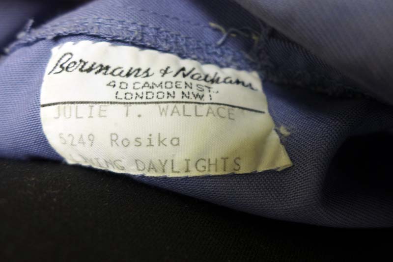 Made from blue cotton material, the collared jumpsuit has a zipper running down the front with back and breast pocket fastened with a press stud. The ‘Trans-Siberian Pipeline’ logo has been screen-printed onto patches located on the back and breast pocket. There is a Bermans & Nathans label located in the collar reading “Julia T. Wallace, 5249 Rosika, Living Daylights.” The back pocket is coming away from main body of the suit, otherwise the piece otherwise remains overall in very good condition. You still can see the make-up marks at the collar! This jumpsuit was prominently screen seen in THE LIVING DAYLIGHTS. Dimensions: measures 59 cm (23 ¼”) across the chest; inside leg measures 79 cm (29 ¼”)