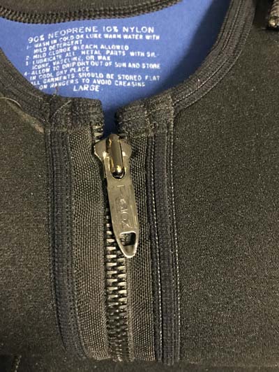 Made of black neoprene material with silver panels running down the sides, the diving suit features detachable Velcro strapping at the shoulders, a blue lining and a zip-up front. Displaying minor wear from use, this diving suit remains in very good condition. Dimensions: Marked size large