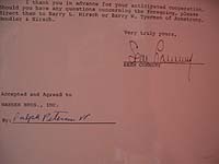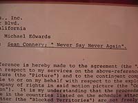 WE GOT HOLD OF A MAJOR PIECE OF JAMES BOND HISTORY! Original signed NEVER SAY NEVER AGAIN 007 document, two pages, 8.5 x 11. This is an Agreement between Connery and Warner Bros. Studios regarding his upcoming Bond film, Never Say Never Again, the name of the 007 film NEVER SAY NEVER AGAIN is WRITTEN!!!, it is a contract piece regarding “the proceeds of the Picture in the countries listed on the Schedule…are not freely remittable to your company…Contingent Compensation now or hereafter payable to or on my behalf in each of the respective Blocked Territories.” Signed on the second page by Connery and a Warner Bros. representative. As it is signed by Sean Connery and the Warner Bros. representative this was a legal document! Matted and framed with two photos from Never Say Never Again and a small name plate, to an overall size of 29 x 29. Items like this normally NEVER hit the collectors market. A one time chance! Highest valueable!