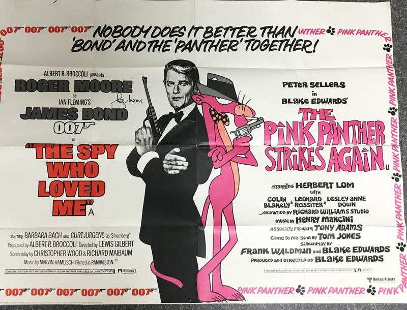 Sir Roger Moore left us forever. We did many official signings with him over the years and we will sadly miss him. Here we can offer a ONE OFF CHANCE ORIGINAL FILM RELEASE YEAR 1977 SPY WHO LOVED ME COMBINATION POSTER WITH THE PINK PANTER FILM BY BLAKE EDWARDS. BOTH FILMS CAME TO THE CINEMA'S IN THE SAME YEAR SO UNITED ARTISTS DID THIS COMBINATION ADVERTISEMENT POSTER WHICH IS INCREDIBLE FOR ITS OWN ALREADY. Sir Roger Moore signed this poster wonderfully for us within our official private signing in November 2013. Now it is a once in a collectors lifetime chance to own this fantastic piece! One of our many direct official signings with Sir Roger! BUY A WONDERFUL AUTHENTIC SIR ROGER MOORE AUTOGRAPH ON A MORE THAN RARE TO FIND ORIGINAL JAMES BOND FILM RELEASE YEAR PROMOTION POSTER WITH CRYSTAL CLEAR HISTORY AND PROOF FROM B'BC. The poster is folded as all vintage original film release year Posters were folded. But it is in nice condition. They started to roll the Posters way later around at the Goldeneye time.