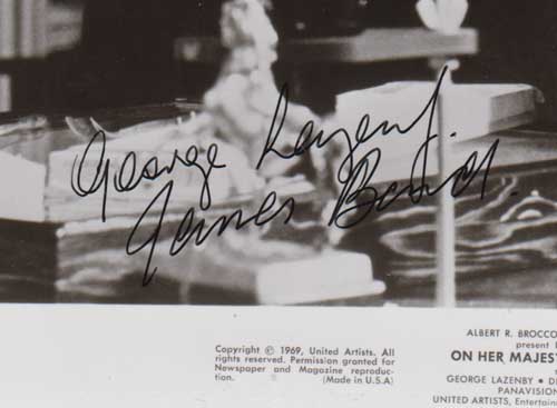 This is a real rarity! 8x10 bw shot from OHMSS, signed wonderfully by George Lazenby as James Bond. He often signs with 007 Addition but we NEVER DID SEE ANY AUTOGRAPH FROM HIM SIGNED BY HIM WITH THE REAL "JAMES BOND" ADDITION TO HIS SIGNATURE! A true one of a Kind Piece and a top rarity! Obtained from an employer of famous Bonham's auction house who is a great bond fan and collector himself and well known in the Hobby.