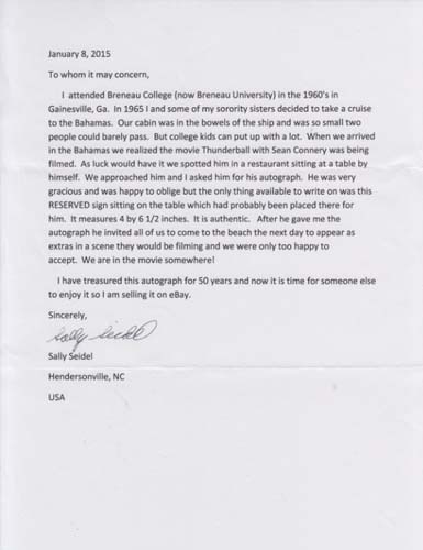 What a find! ORIGINAL JAMES BOND 1965 THUNDERFALL FILM SET PROP / PRODUCTION USED FILM PROP. TOP RARITY AS REAL THUNDERBALL FILM SET PROPS OR FROM ANY OF THE OTHER SEAN CONNERY ERA BONDS ARE NEARLY IMPOSSIBLE TO GET TODAYS. A "RESERVED" CARD FROM THE TABLE WHERE SEAN CONNERY DID SIT ON THE THUNDERBALL BOND FILM SET AT THE BEACH IN THE BAHAMAS. AUTHENTIC SIGNED BY SIR SEAN CONNERY ON THE FILM SET OF THUNDERBALL. THE LADY WHO GOT THE AUTOGRAPH IN-PERSON HAD IT NOW FOR MORE THAN 50 YEARS AND GAVE IT NOW TO US. WHEN SHE ARRIVED ON THE BAHAMAS FOR VACATION IN 1965 SHE REALIZED THE MOVIE TUNDERBALL WITH SEAN CONNERY WAS FILMED, SHE SPOTTED HIM IN A RESTAURANT NEAR THE SET SITTING AT A TABLE. SHE ASKED HIM FOR HIS AUTOGRAPH AND HE WAS VERY GRACIOUS AND WAS HAPPY TO OBLIGE BUT THE ONLY THING AVAILABLE TO WRITE ON WAS THIS RESERVED SIGN; SITTING ON HIS TABLE WHICH HAS BEEN PLACED THERE FOR HIM. AFTER HE GAVE HER THE AUTOGRAPH HE INVITED HER AND HER FRIENDS TO COME ON THE BEACH THE NEXT DAY TO APPEAR AS EXTRAS IN A SCENE THEY WOULD BE FILMING. SO SHE EVEN WAS IN THE FILM!