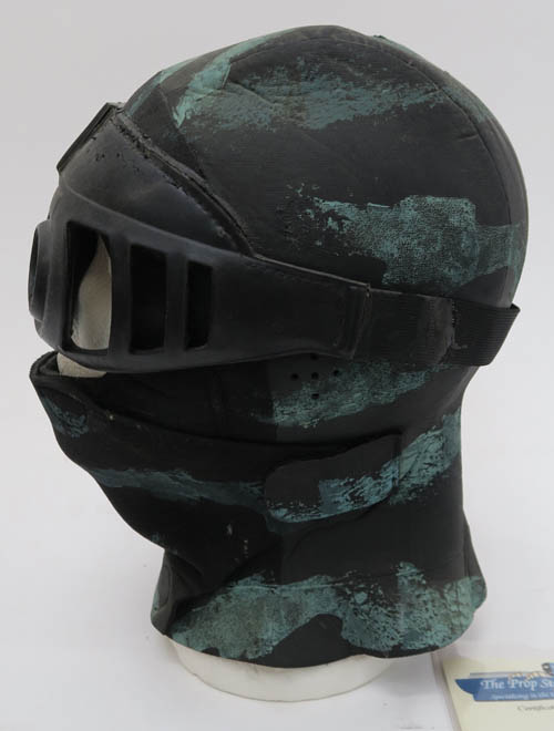 This hood comes from the opening sequence in which Bond and his two commandos land in North Korea. Manufactured by NeilPryde, this mask is made of a 3mm stretch mesh material and has been decorated with paint and small amounts of glitter by the prop department in Pinewood for the film. The camouflage effect was painted on using light blue and grey colors. This item shows some wear due to production use but remains in overall good used condition. A wonderful Screen used prop/wardrobe Piece from DIE ANOTHER DAY! A real one-off Chance!