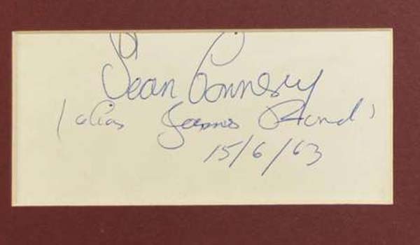 THE RAREST ONE WE COULD FIND IN MORE THAN 35 YEARS OF COLLECTING JAMES BOND AUTOGRAPHS! WE GOT HOLD OF A SIGNED ALBUM PAGE BY SIR SEAN CONNERY WHICH IS MORE THAN SPECIAL! HE SIGNED IT IN 1963, THE FILMING YEAR OF FROM RUSSIA WITH LOVE. WONDERFULLY SIGNED BY HIM WITH HIS RARE VERY CLEAR SIGNAUTRE BUT ONE MORE THING IS THE REAL RARITY SPECIAL! HE ADDED "ALIAS JAMES BOND 15/6/63". IN ALL OUR COLLECTIN TIME FOR MORE THEN 3 DECADES WE NEVER SAW ANYTHING SIGNED BY HIM ALSO WITH THE "JAMES BOND" ADDITION. THIS MAKES IT TO AN ABSOLUTELY FRONT PIECE FOR A HIGH-CLASS JAMES BOND COLLECTION. A ONE-TIME CHANCE IN A COLLECTORS LIFE! OBTAINED FROM A VERY FAMOUS UK COLLECTION WE DEALT FOR YEARS WITH. THE COLLECTOR ALSO WORKED FOR BONHAMS AND CHRISTIE'S AUCTION HOUSES. MATTED WITH AN 8X20 BW SHOT AS JAMES BOND WITH WHITE TUXEDO AND IS READY TO BE FRAMED.