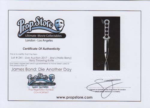 RARITY SCREEN SEEN HEREO WARDROBE PIECE FROM DIE ANOTHER DAY! THIS IS THE ORIGINAL HAND TAILORED CAMOUFLAGE TROUSERS WORN BY HALLE BERRY AS JINX IN DAY ANOTHER DAY. THE COSTUME DESIGNER OF THE JAMES BOND PRODUCTION FOR THIS ITEM WAS LINDY HEMMING. THIS TROUSER WAS CUSTOM MADE FOR HALLY BERRY - IT IS NOT A STANDARD CAMOUFLAGE TROUSER. THIS ITEM WAS SOLD BY THE OFFICIAL ANGEL'S AUCTION AT BONHAMS AUCTION HOUSE. THIS WAS A ONE TIME SALE OF ANGEL'S THE COSTUMIER OF THE BRITISH FILM INDUSTRY. ANGEL'S CLEARED A FEW ITEMS OF THEIR STOCK. COMES WITH DETAILED HISTORY INFORMATION, PHOTOS OF HALLE WEARING THE TROUSER IN THE FILM AND A NEWSPAPER ARTICLE ABOUT THE ANGEL'S COSTUME SALE. HERE IS YOUR CHANCE TO OWN A SCREEN SEEN HERO WARDROBE PIECE FROM THIS OSCAR WINNING ACTRESS WITH FLAWLESS AND PROOF OF AUTHENTICITY! THE TROUSER HAS SEWN IN ALSO THE ANGEL'S TAG AND WRITTEN "HALLE BERRY" ON IT. ALSO THE AUCTIN TAG IS INCLUDED! A ONE TIME CHANCE IN YOUR COLLECTORS LIFE!