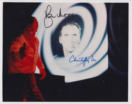 Sir Roger Moore (+) & Sir Christopher Lee (+) Cast Autograph, 8x10 color shot